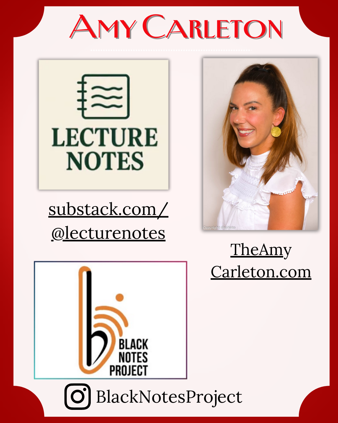 My guest this week is Amy Carleton, Ph D. She teaches in the Comparative Media Studies/Writing program at MIT and is the co-founder of Black Notes Project, a Charlotte, NC-based music festival and nonprofit, as well as the creator of Lecture Notes, a public humanities series (and now Substack!). Her research focuses on the behavioral economics of online communities and the intersection of race and digital culture. She is a recipient of the MIT Teaching With Digital Technology award, holds a graduate certificate in Diversity, Equity, and Inclusion from Cornell University, and was selected by the WikiEducation Foundation as a Wikipedia Black History Scholar. Find out more about Amy through her website TheAmyCarleton.com