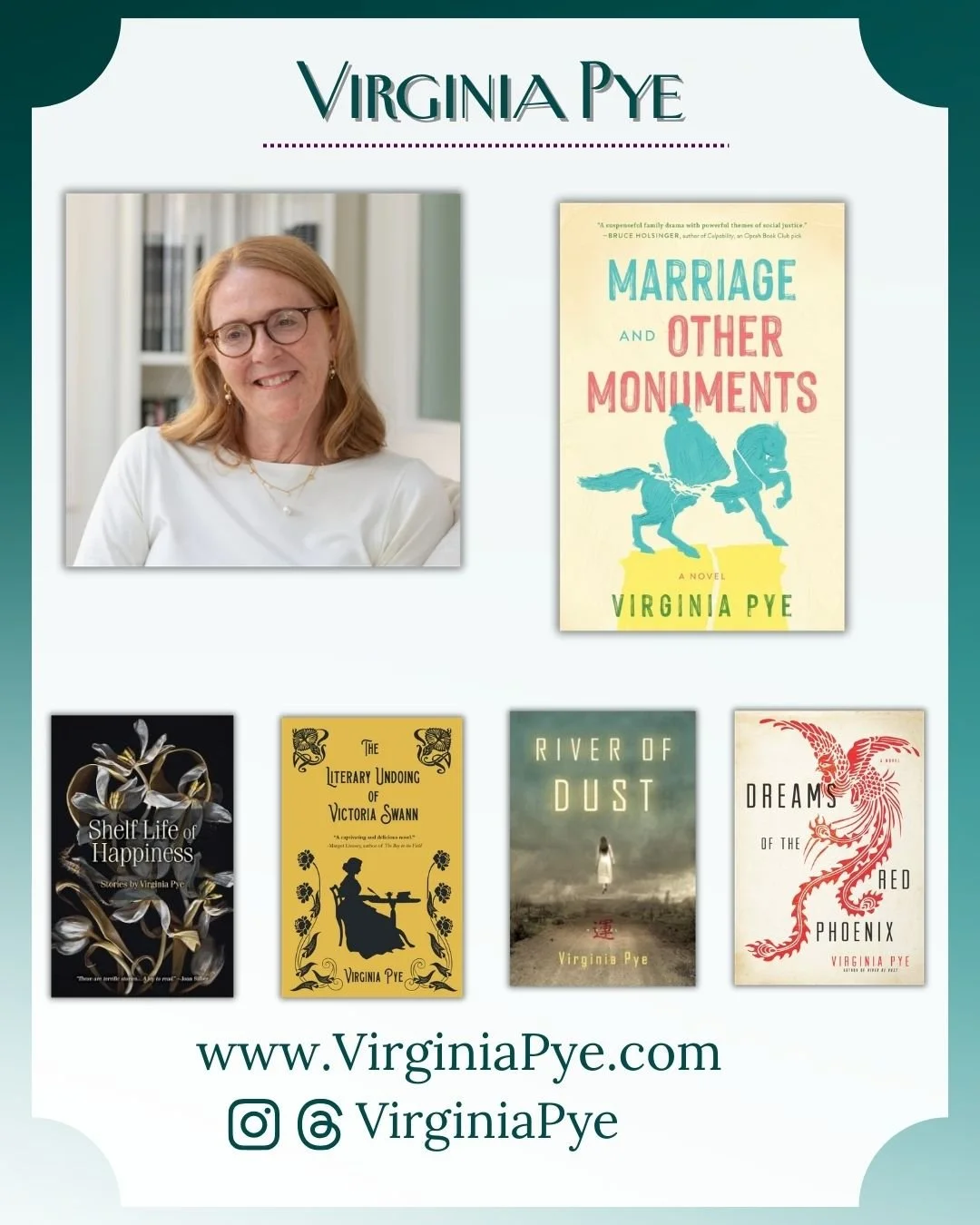 Kirkus Reviews calls Marriage and Other Monuments, Virginia Pye’s recently published book, “A fascinating and audacious novel of family, marriage and a society in flux.” It is a #1 Amazon bestseller in New Southern FictionVirginia’s essays have appeared in The New York Times, Literary Hub, Publisher’s Weekly, Writer’s Digest, The Rumpus, and elsewhere. She has taught writing at New York University and the University of Pennsylvania, and, most recently, at GrubStreet in Boston. Virginia is Fiction Editor of the literary journal Pangyrus and serves on the board of the Women’s National Book Association, Boston Chapter.